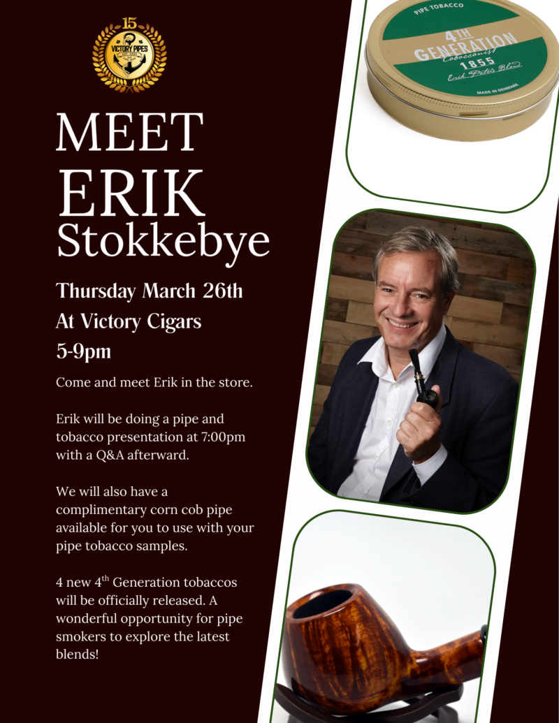 An Evening with Erik Stokkebye Thursday, March 26 | 5:00pm till 9:00 pm Come and meet Erik in store. Enjoy a sample of Erik’s 4th generation tobacco. This event is free to attend and is open to new pipe smokers as well as seasoned veterans. Erik will be doing a pipe and tobacco presentation at […]